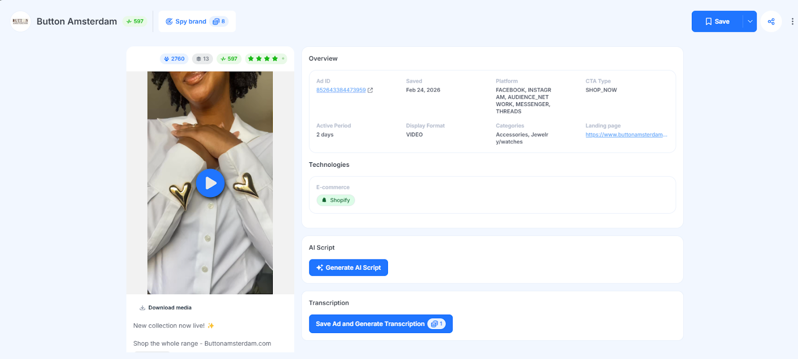 GetHookd lets you research which UGC ad concepts are converting on Meta before you produce anything. Brand Spy specifically shows which ones competitors are actively scaling. From there, Ads Transcription extracts the hooks, scripts, and CTAs from any video ad so you can recreate what's working. Video Scripts generates new scripts from your product details, while Clone Ads produces static UGC variations, all in one platform.