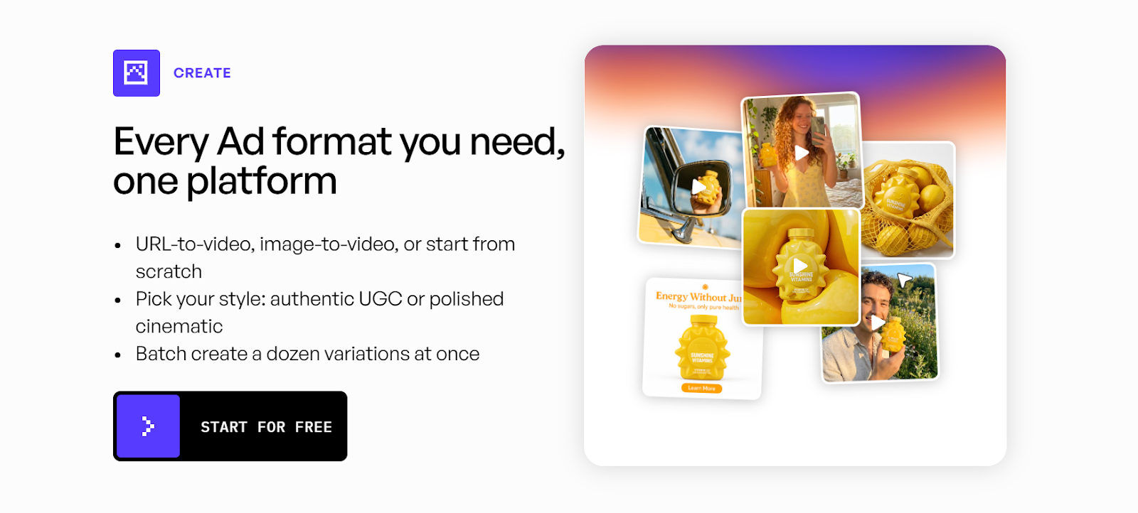 Creatify offers a free plan with 10 credits per month (watermarked, 720p). Paid plans start at $19/month.