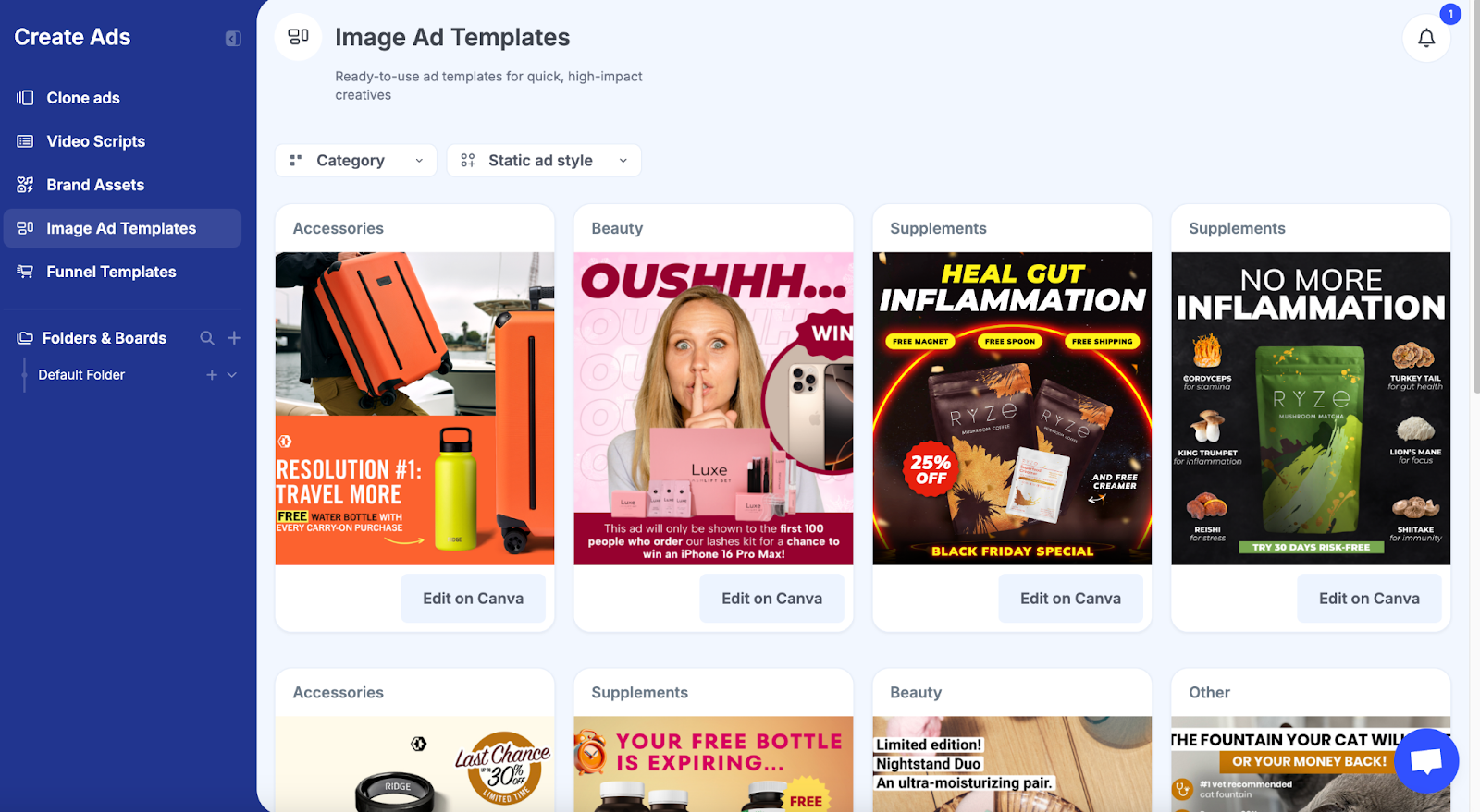 Image Ad & Funnel Templates: Ready-to-use static ad designs across dozens of niches, plus plug-and-play landing page templates modeled on high-converting flows.