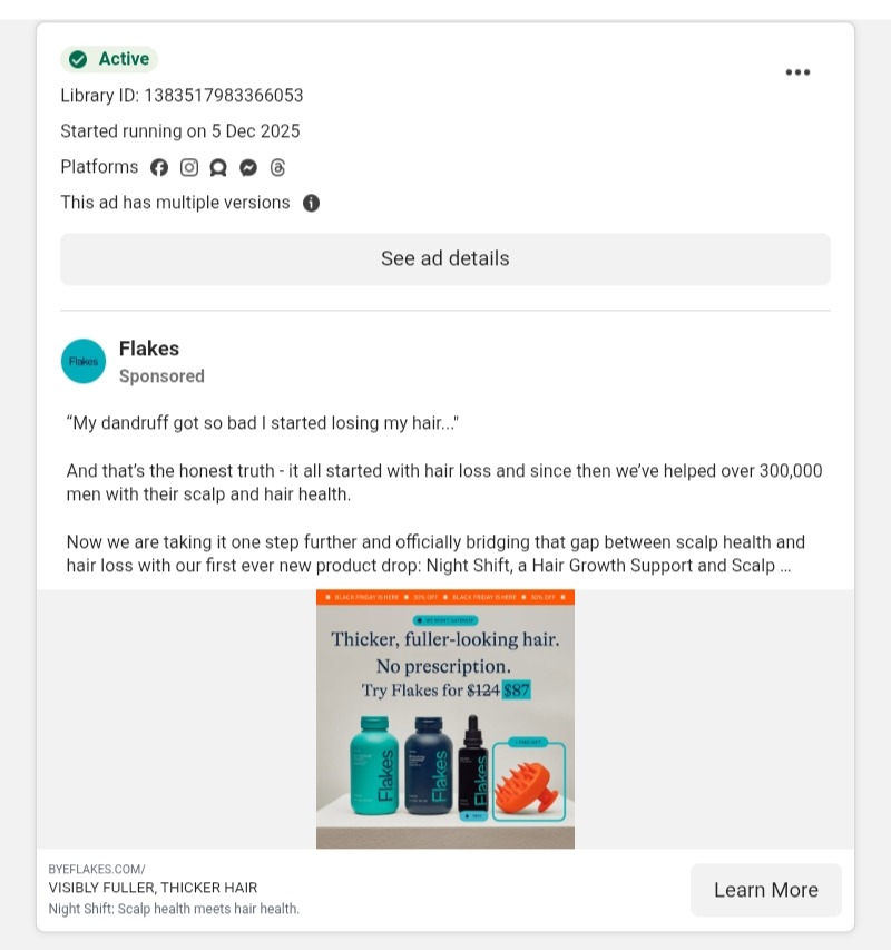 Flakes ad doesn't open with a discount or a product shot. It opens with a confession: "My dandruff got so bad I started losing my hair." That vulnerability does real conversion work because it mirrors exactly what their target audience is experiencing.