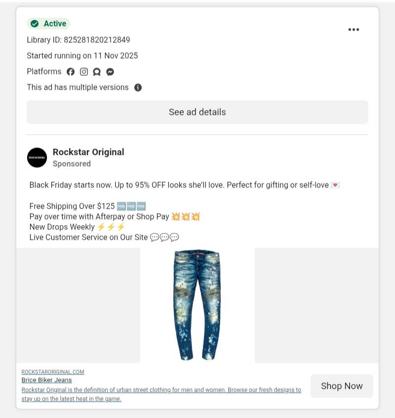 Rockstar Original Black Friday Facebook ad promotes their Brice Biker Jeans at up to 95% off, stacked with free shipping for items over $125, buy-now-pay-later options through Afterpay and Shop Pay, and live customer service. The result is a value proposition so layered that every possible purchase objection is addressed before the buyer even clicks through.