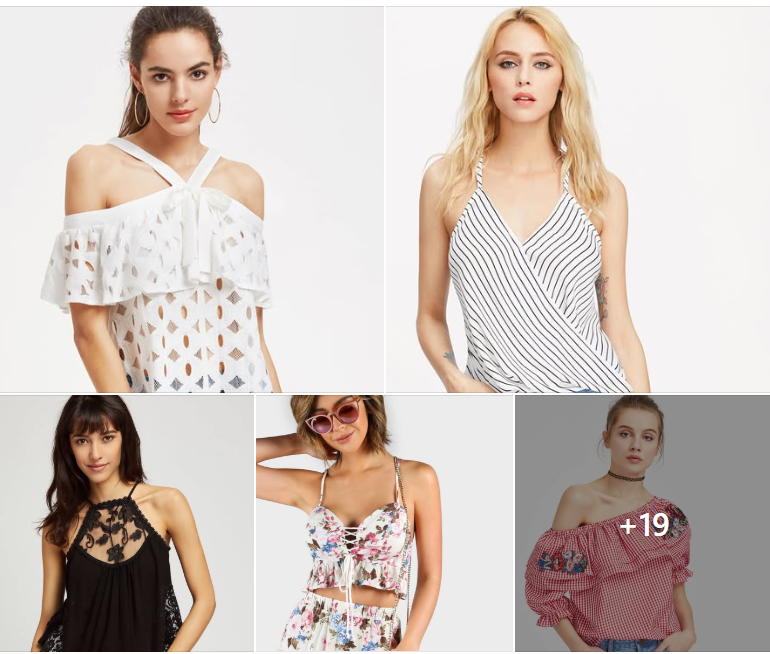 Shein uses the carousel format as a mini storefront, showcasing a variety of summer tops across multiple cards. Each card features a different style: lace, stripes, floral, gingham, giving shoppers plenty of options to browse in a single ad.