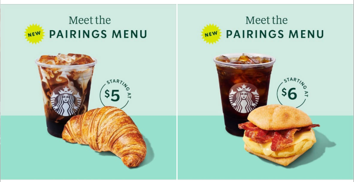 Starbucks uses the carousel format to promote its new Pairings Menu, featuring different drink-and-food combinations on each card. Each pairing has its own price point ($5, $6), making it easy for customers to see exactly what they'll pay before they click.