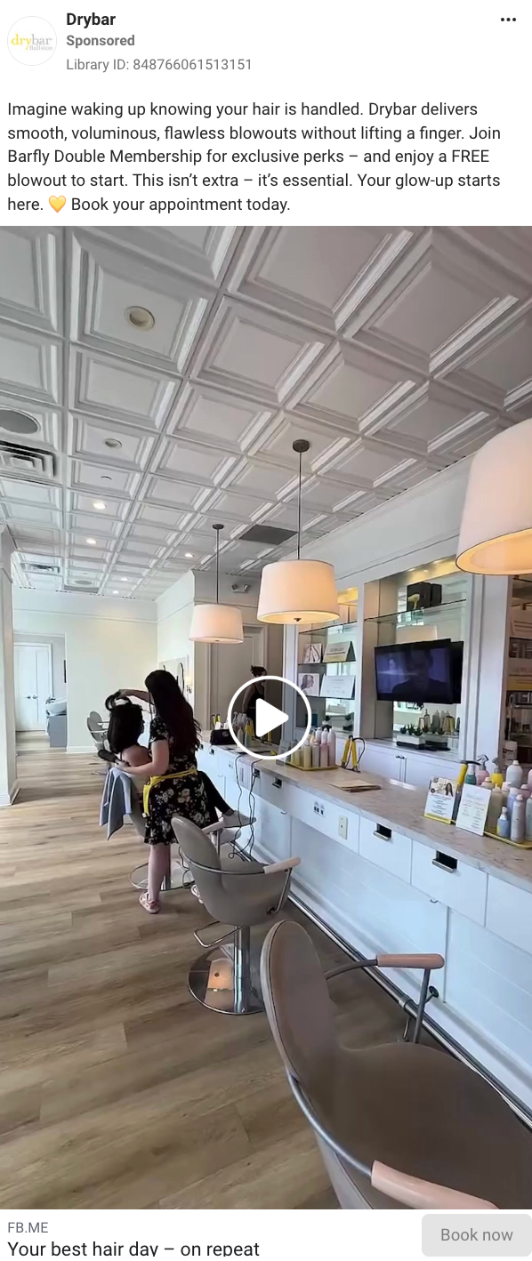 Drybar's Facebook video ads focus on a single service, typically their signature blowout, filmed in their recognizable yellow and white branded environment. The video runs under 30 seconds and opens on the finished look rather than the beginning of the styling process. That sequencing decision is what drives performance.