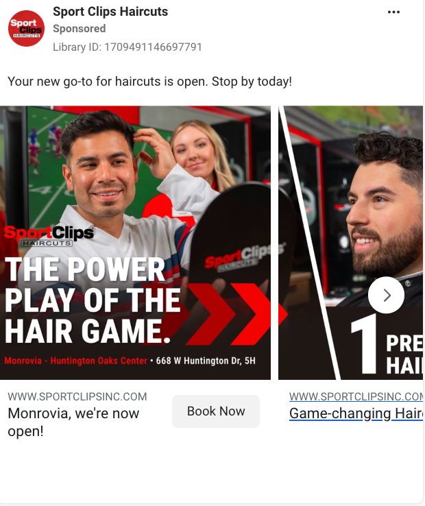 Sport Clips runs Facebook ads designed around tight demographic targeting rather than creative complexity. The ads feature sports imagery, short copy, and a direct booking CTA. The goal is not to reach the widest possible audience but to speak directly to men who want a fast, sports-themed haircut experience.