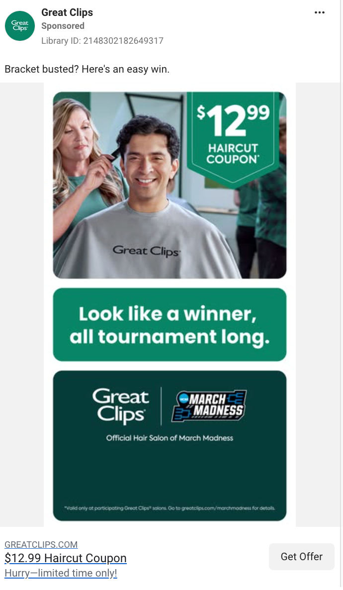 Great Clips runs Facebook ads built around a single, clean offer: a discounted haircut with a fast redemption path. The creative is minimal, the headline leads with the saving or price point, and the click goes directly to a booking page or digital coupon. The lack of extra context keeps the decision simple for the viewer.