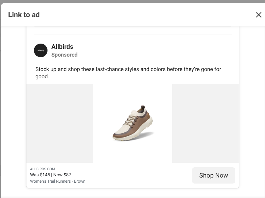 Sometimes the product is the hero, and the smartest thing you can do is get out of its way. Allbirds regularly runs image ads featuring a single product on a clean, minimalist background, accompanied by a short headline and a "Shop Now" CTA.