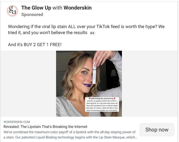The best-performing Facebook ads in 2026 are often the ones that don't look like ads at all. This Wonderskin ad is a perfect example. A selfie-style image of someone holding the product, text overlay that reads like a creator addressing their audience, and copy that leads with viral social proof ("the viral lip stain ALL over your TikTok feed"). It feels like a friend's recommendation, not a sponsored post.