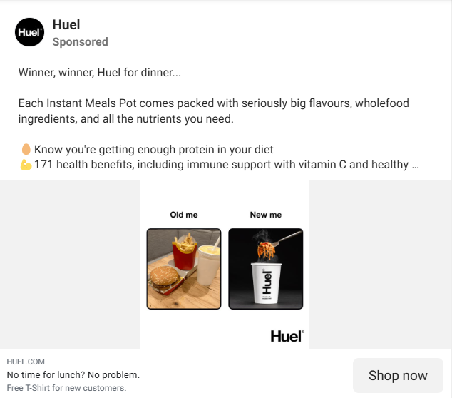 Comparison ads are among the oldest direct-response tactics, and they're still undefeated in 2026. Huel's Instant Meals Pot ad uses the trending "Old me / New me" meme format to position fast food side by side with its product.
