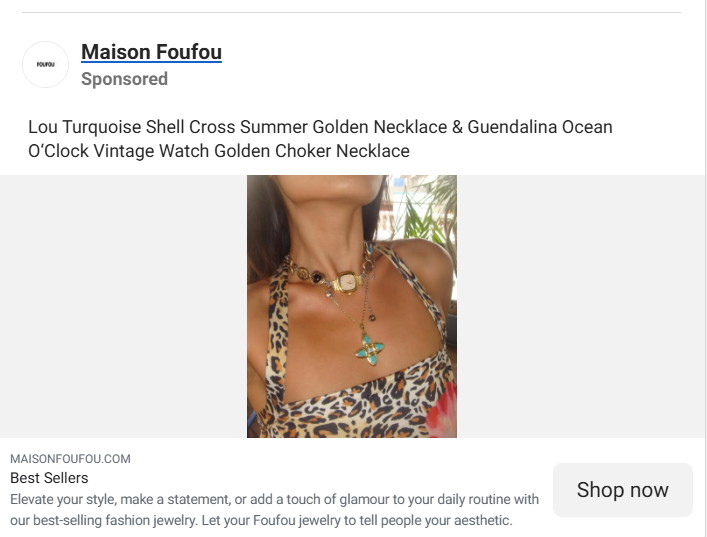 Certain products sell themselves when you simply show them being worn, used, or experienced. This Maison Foufou ad does exactly that. A close-up of someone wearing layered gold jewelry in a natural, sun-lit setting. No text overlay on the image, no complicated messaging. The product is the entire ad, and the visual does all the selling.