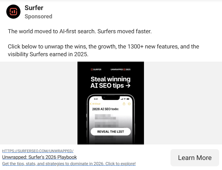 Surfer's ad teases content without giving it away: "Steal winning AI SEO tips →" with a phone mockup showing a blurred list titled "2026 AI SEO todo: REVEAL THE LIST." Everything about this ad is designed to create an information gap that the viewer can only close by clicking.