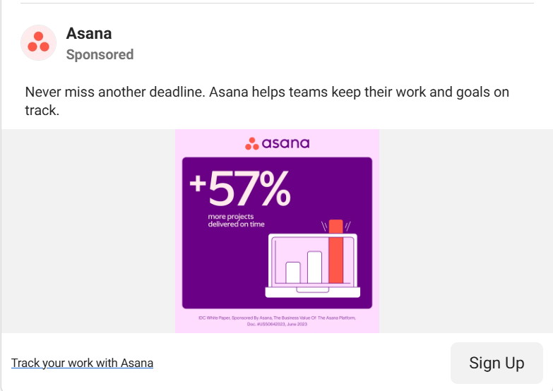 Asana leads with a single stat: "+57% more projects delivered on time." It's displayed in large type on a purple-branded background, with a simple bar chart visualization. Data-driven ads work in SaaS because the buying decision is rational rather than emotional. Your audience wants to know that your product delivers measurable results. A specific, credible number communicates more value in one second than a paragraph of copy ever could.