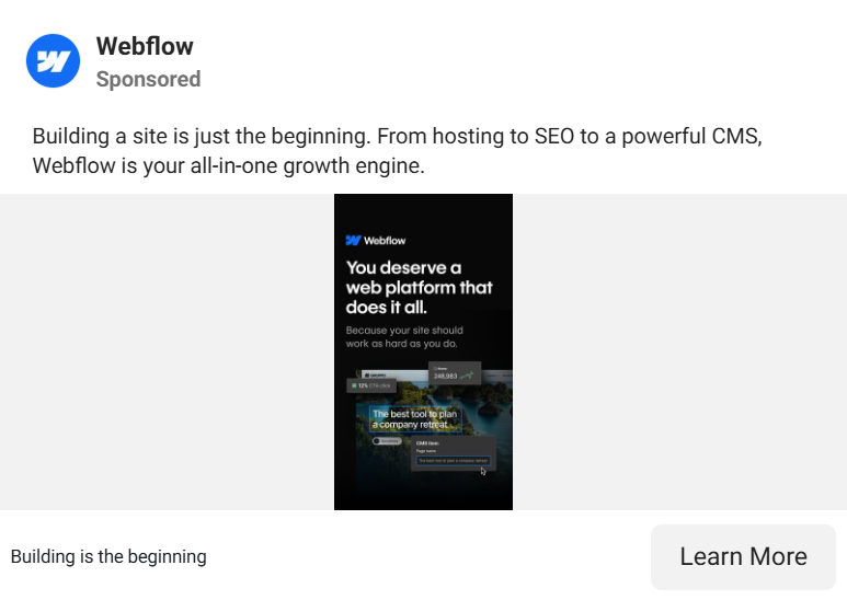 This approach works when your product solves a fragmentation problem: when your audience is tired of stitching together multiple solutions. The ad doesn't need to explain what Webflow does feature by feature. The value proposition alone qualifies the right viewer and repels the wrong one.