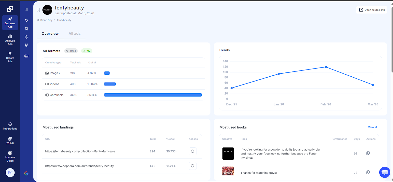 Brand Spy lets you see exactly which ads your competitors are actively scaling on Meta, not just running. It surfaces the landing pages behind those campaigns, the hooks driving engagement, and the creative formats getting the most traction, giving you enough context to understand why something is working and apply those patterns to your own campaigns.