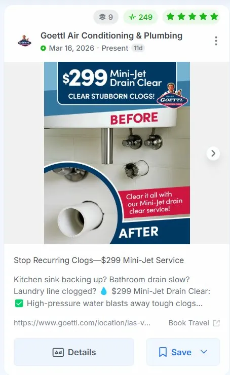 "$299 Mini-Jet Drain Clear" anchors the offer immediately, removing the most common objection in service-based ads before the viewer has even processed the visual.