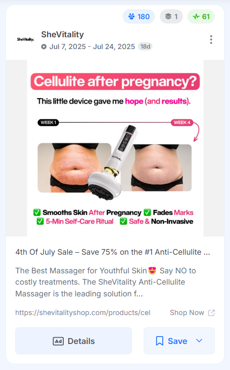 SheVitality makes the timeframe part of the visual itself. "Week 1" and "Week 4" are labeled directly on the creative, which manages expectations and adds credibility without requiring the viewer to read the copy.