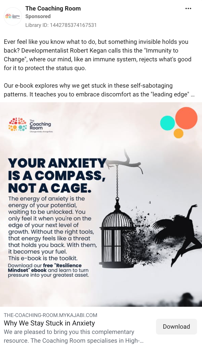 Direct offer ads skip the free entry point and promote the coaching program or service outright. These perform better with warm audiences who are already familiar with the coach, or in lower-competition niches where purchase intent is higher.