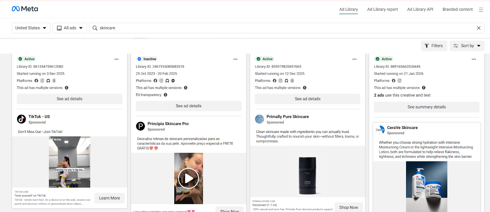 Each ad displays its start date, active/inactive status, page name, and page ID. Long-running ads are a strong proxy signal. If a competitor has been running the same creative for weeks or months, it's likely performing well enough to keep spending on.