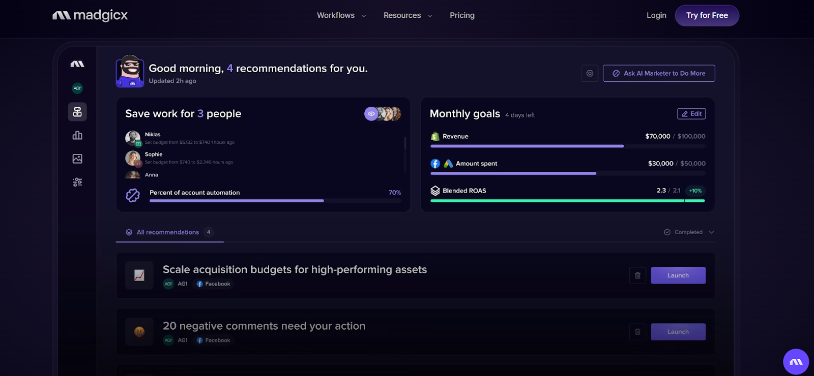 Madgicx positions itself as an all-in-one Meta advertising tool that combines campaign automation, AI-driven optimization, and audience targeting. The platform’s AI Marketer feature audits your ad account daily and surfaces recommendations for improving performance, while automation rules handle budget shifts and bid adjustments.