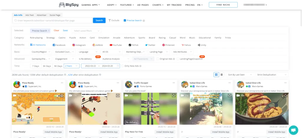 The platform has a large ad database with filtering options for keywords, engagement, ad type, CTA, country, and more. It’s useful for spotting trends and finding creative inspiration across multiple networks.