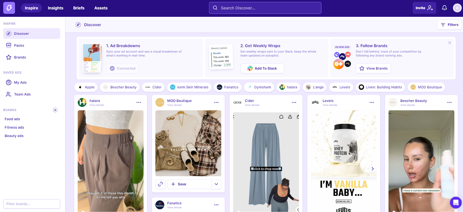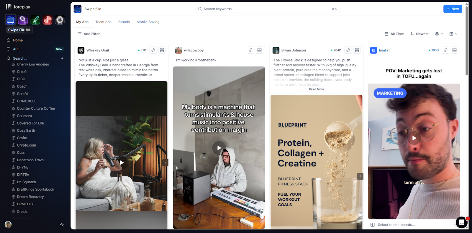 - Save Ads: Capture ads to a personal library sorted by boards and folders. Unlike Moat, these don’t vanish when the original campaign stops.
