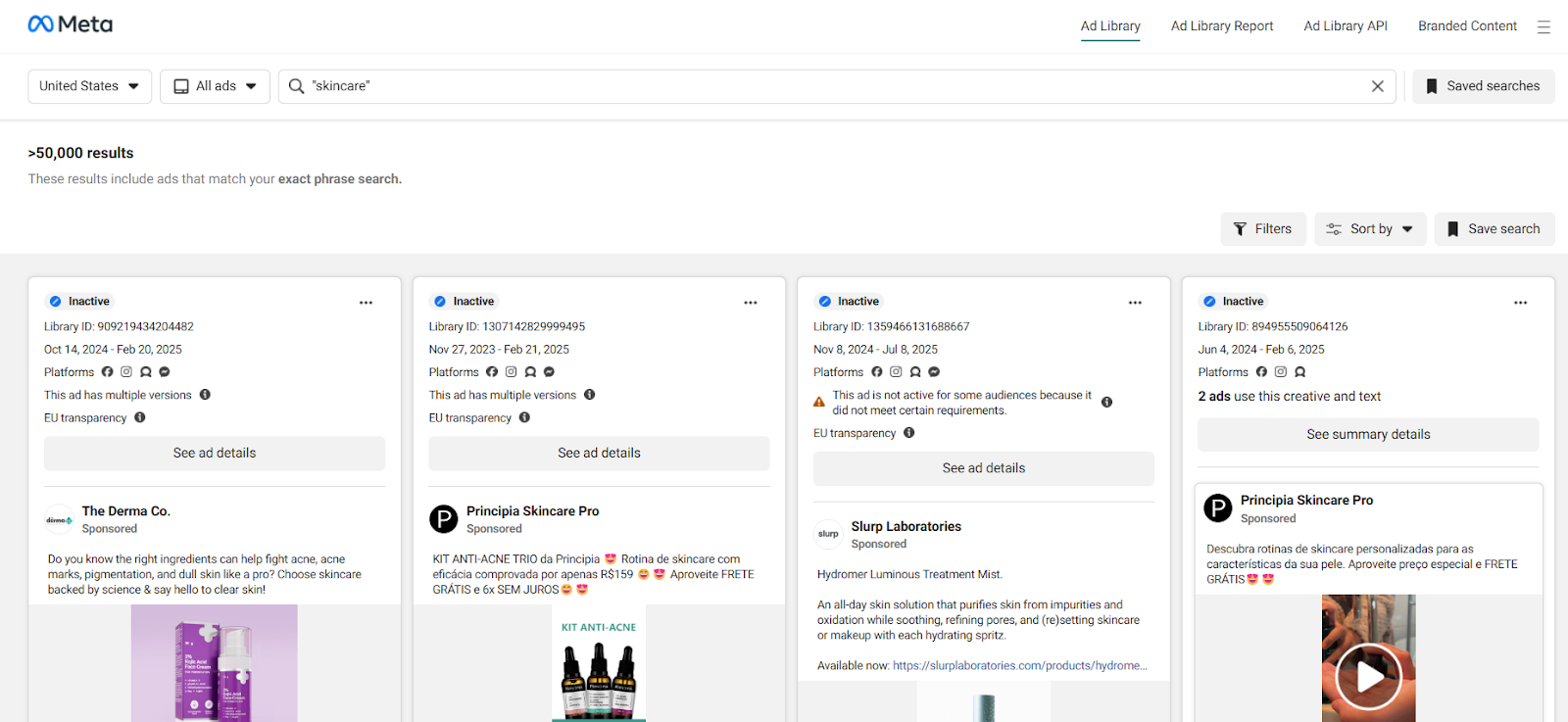 - Filters: Narrow results by country, platform (Facebook or Instagram), media type (image, video, carousel), and active status.