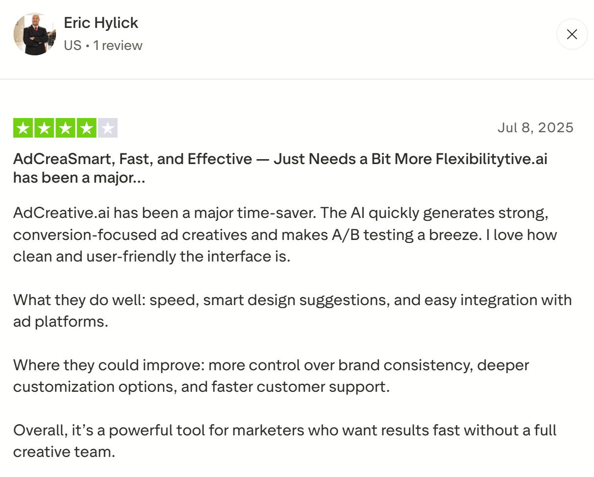Ad Creative AI reviews are mixed but skew positive. Marketers frequently cite the platform’s intuitive interface and time-saving capabilities as its main strengths, and the AI-generated copy generally produces platform-appropriate messaging without requiring extensive editing.