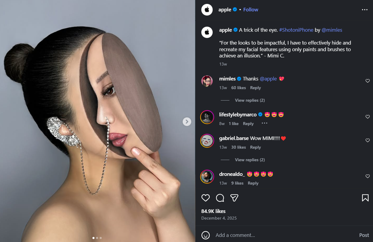 Apple’s Shot on iPhone campaign is one of the clearest examples of this principle at scale. Rather than producing studio content, Apple features photos taken by iPhone users, crediting the actual people behind each shot.