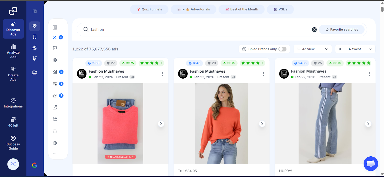 AI covers the full advertising workflow — research, creative, targeting, and performance analysis — but only when those stages are connected. Most AI advertising tools start at the production stage, assuming you already know what angle, format, or hook to lead with. Our platform starts earlier. Before a single asset is produced, Explore Ads gives you a searchable database of 65M+ Meta ads filtered by niche and performance, while Brand Spy shows exactly which creatives your competitors are putting budget behind and where that traffic lands.