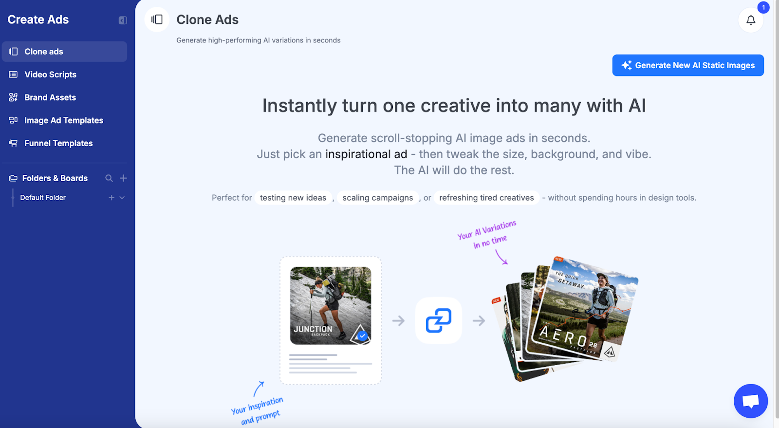 Clone Ads instantly produces multiple visual variations of any static creative, and Image Ad Templates give you ready-to-use designs across dozens of niches.